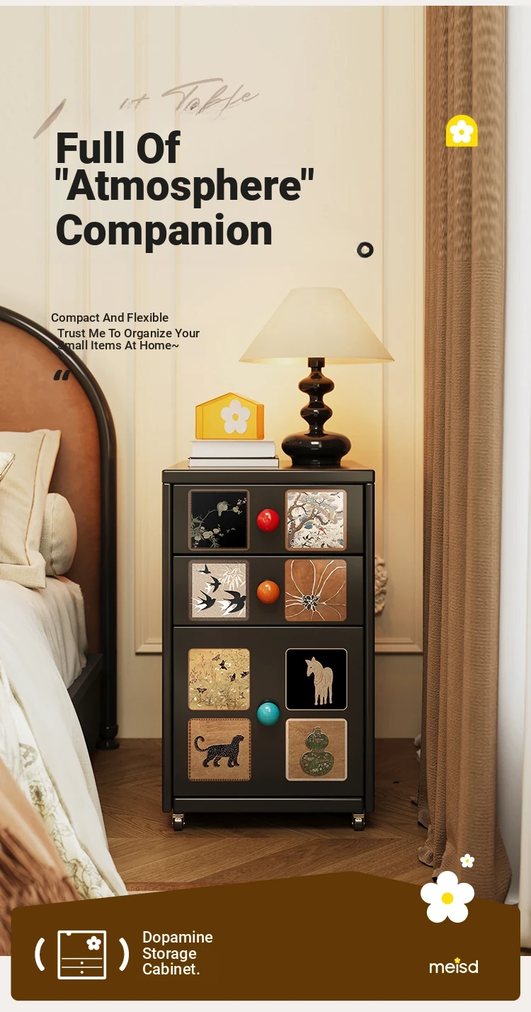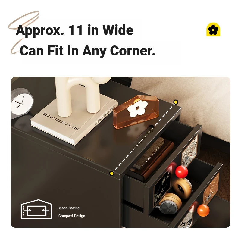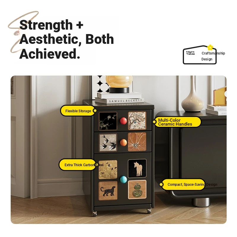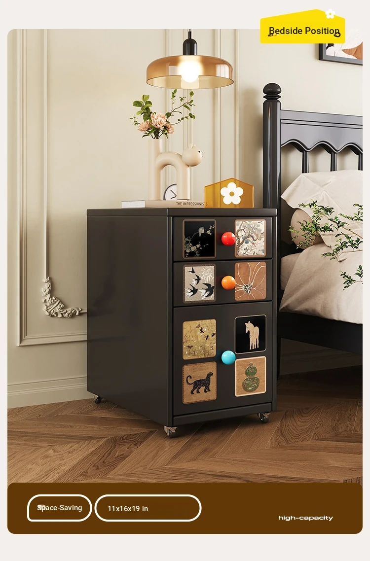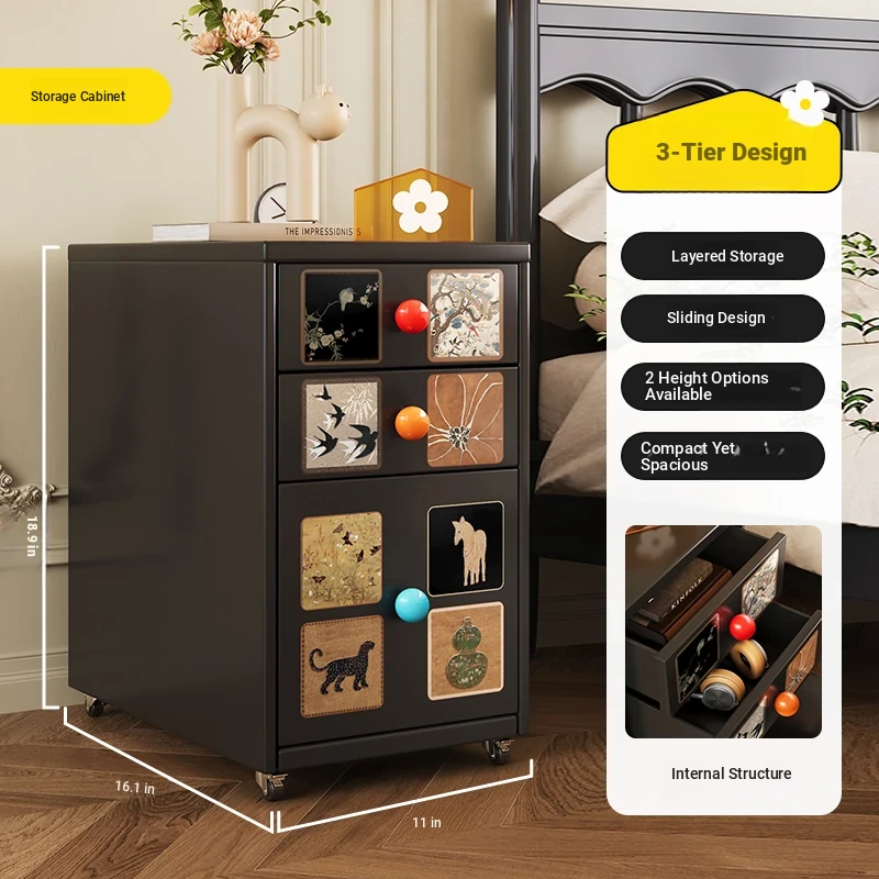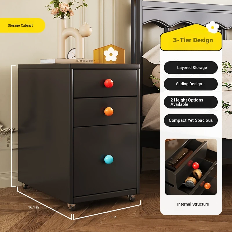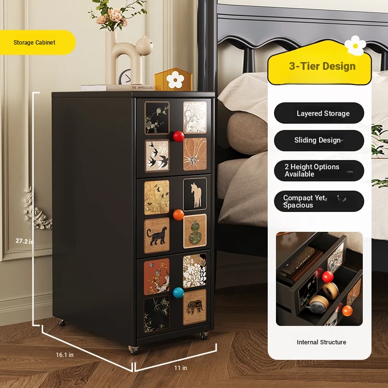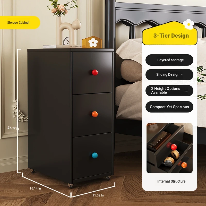 Meisida Vintage-Style Black Narrow Bedside Cabinet - Compact and Mobile Iron Storage Nightstand for Home Bedrooms